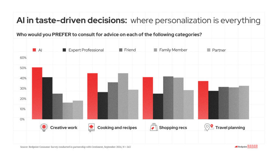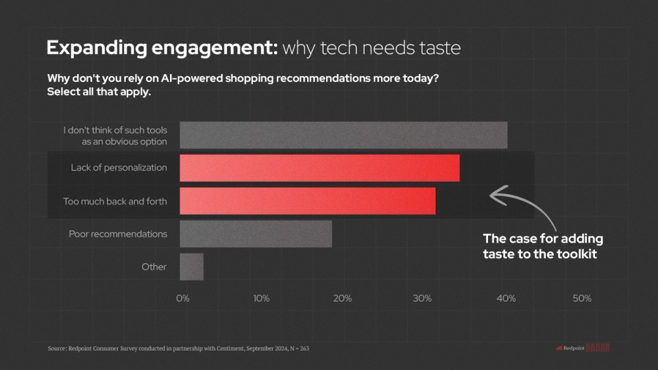 Taste, like trust, is tricky to pinpoint, making it an incredibly valuable asset. Taste is personal and often ephemeral. While social media has thrived as a medium for capturing and broadcasting taste in real-time, the traditional world wide web has struggled to keep up, especially as trends have evolved over time. Nuanced and personalized taste along every step of the search, discovery, and planning journey is what AI can uniquely deliver, and what we at Redpoint continue to dream of.