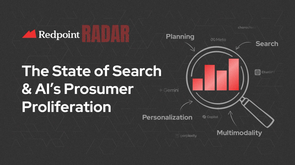 Yet consumers today (Team Redpoint included!) are begrudgingly awaiting this technicolor transformation, as they continue to rely upon traditional search engines in favor of their AI counterparts 2:1, prioritizing the certainty of the status quo over the creative potential of next gen apps.