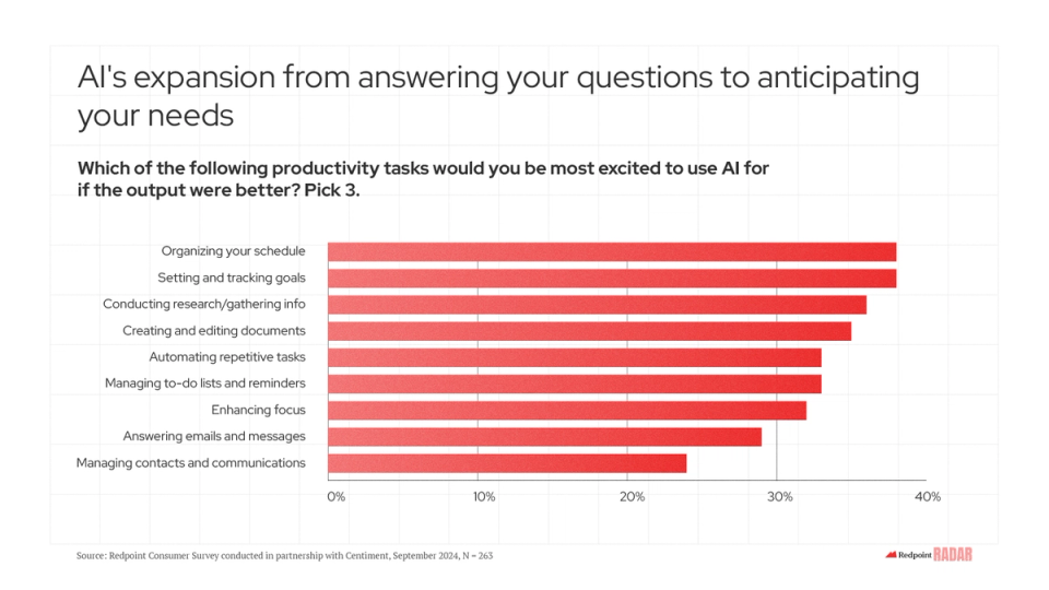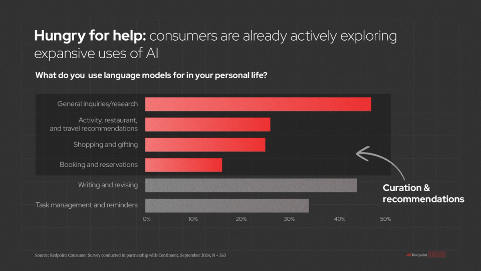 However, we know that both imagination and intention are there with >70% of consumers eager for AI to transform their shopping, planning, and booking experiences over the next 5 years. We at Redpoint fantasize about this future daily, whether we’re ideating upon a new event concept for our founders or dreaming up some new swag for our advisors. While we’ve talked in the past about concierge culture as a wedge, we indeed expect AI’s expanded sphere of influence to impact almost every interaction consumers have with technology over time.