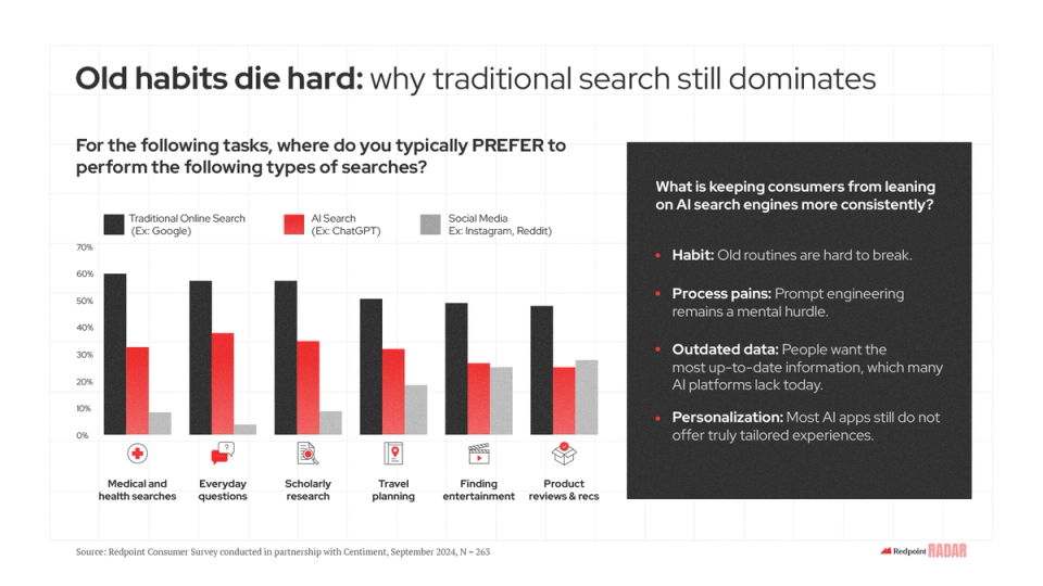 Yet consumers today (Team Redpoint included!) are begrudgingly awaiting this technicolor transformation, as they continue to rely upon traditional search engines in favor of their AI counterparts 2:1, prioritizing the certainty of the status quo over the creative potential of next gen apps.