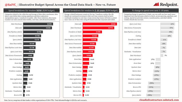 2) Unraveling the data stack. Open ecosystems develop around cloud data, now with a level of interoperability that simply didn’t exist a decade ago. Storage businesses continue to innovate around new data use cases “higher in the stack,” allowing vendors within dashboarding, ETL, data observability, real-time, and more, to flourish. As modular approaches are adopted by teams, hyper-optimized solutions are created to increase the flow of data.