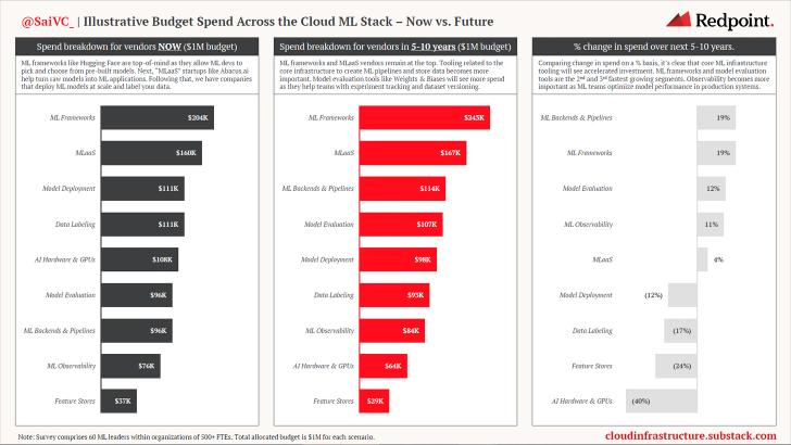 While data budgets remain much larger than machine learning, machine learning ranks as the fastest growing budget within cloud infrastructure. We surveyed 60 ML leaders in our network within organizations of 500+ FTEs and learned that over half expect to double their machine learning budget in the next 5 years. About a quarter further expect to triple their ML budget in the same time period.