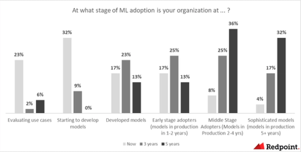 4) Specific budgets for ML. Larger enterprises are carving out machine-learning specific budgets, separate from data ones. More frequently, larger companies have a “Head of Machine Learning,” followed by a dedicated junior team and separate budget allocations for ML solutions.