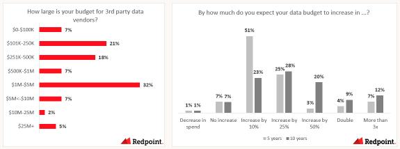 When assessing data spending categories, a quantitative approach helped us understand priorities relative to one another. After giving an imaginary $2M data spending budget to data leaders, they were then asked to rank data solutions by total amount spent. Data leaders were asked to budget hypothetically, with numbers that reflect current spending priorities. Then, these leaders were asked to envision how they might spend in five to ten years. While incomplete in some ways – for example, in providing these subcategories, we cannot account for the emergence of a potential new disruptor – these responses offer valuable insights concerning spending and data prospects.