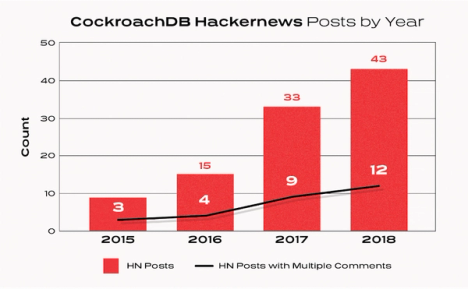 The blue bars show the total posts mentioning “CockroachDB” while the red line shows the total number of posts with multiple comments. You can see Cockroach averaged about one viral HN post per quarter in the early years, which increased to one viral post per month in 2018.