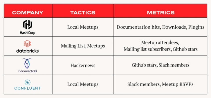 While this table summarizes the different tactics and metrics, tune in below for the incredibly thoughtful perspectives from Mitchell Hashimoto, Founder at Hashicorp, Reynold Xin, Founder at Databricks, Peter Mattis, Founder at Cockroach, and Ale Murray, Director of Community at Confluent.