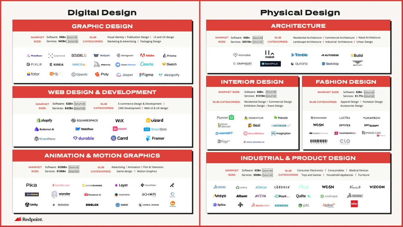 At Redpoint, we’re actively exploring the categories’ addressable opportunities – and have been amazed by the potential. While the combined market caps of publicly traded design applications sits at north of $500Bn today, we believe that the private markets too hold ample enterprise value potential. Given the size and complexity of the opportunity, we suspect that many emerging leaders leveraging AI will first perfect their products for vertical specific use cases. Thus, in beginning to sketch our initial impressions of the landscape, we elected to categorize companies based on the industries they’re transforming. We recognize that there is considerable category overlap between these players and that extensive addressable design opportunity exists beyond these buckets, but our hope is that this initial attempt is fruitful in laying a foundation to build on top of. Over time, it appears likely that many of the most successful software solutions will extend their reach horizontally into adjacent markets. We’ve seen this time and time again from the biggest and boldest ranging from Autodesk to Adobe, and we’re excited for a new wave of category captains to claim their place over the next few years.